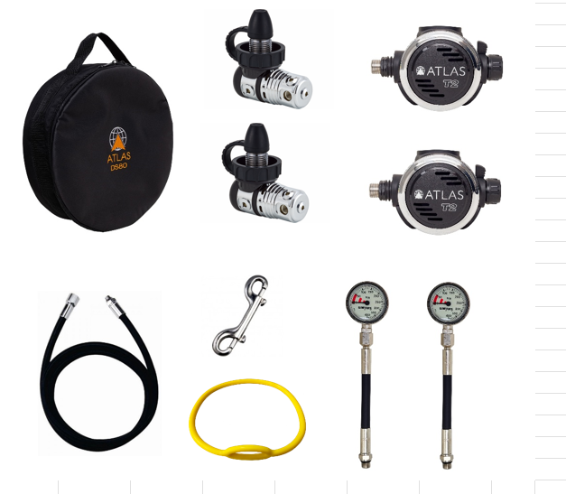 O Kit Atlas SP é um conjunto completo para a prática do mergulho Sidemount, utilizando a configuração padrão com 2 reguladores (um com mangueira de 70 cm e outro com mangueira de 150cm) e 2 manômetros de mangueira curta. Acompanham também uma bolsa de transporte, uma gargantilha e um mosquetão duplo. Nesta versão utilizamos regulador de pistão balanceado.